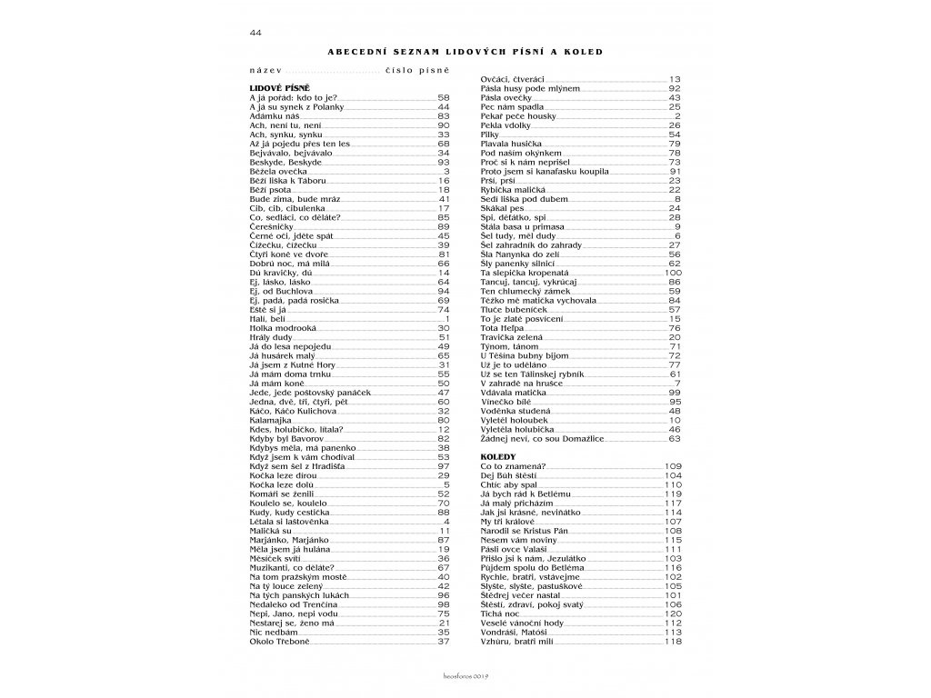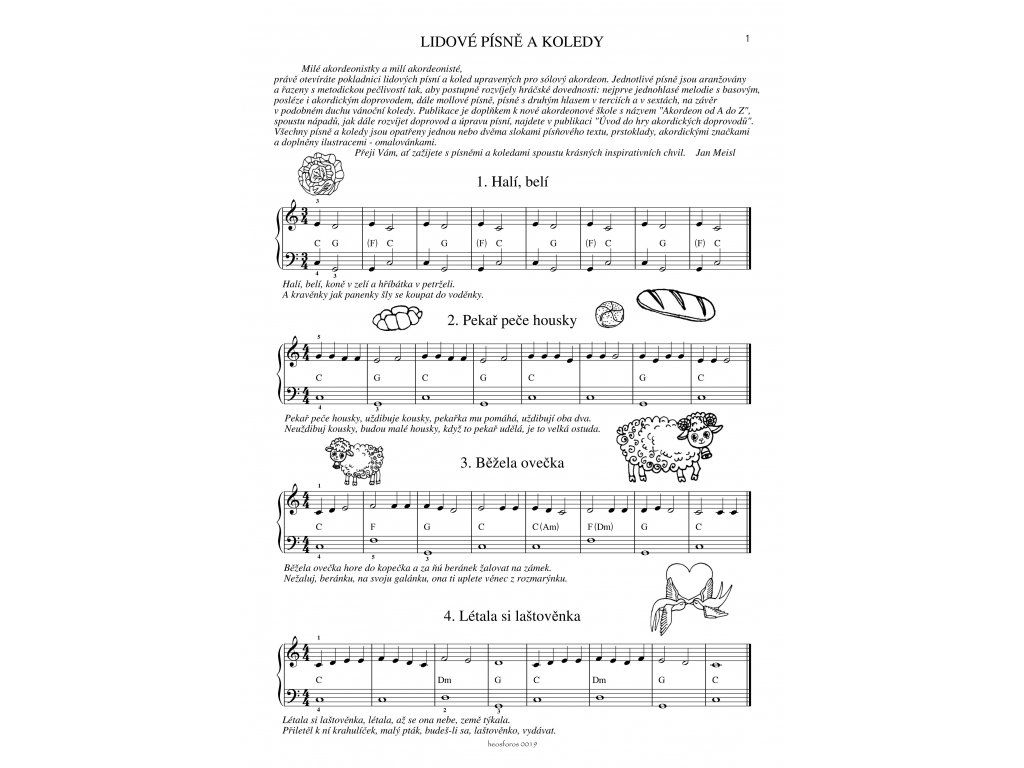 právě otevíráte pokladnici lidových písní a koled upravených pro sólový akordeon. Jednotlivé písně jsou aranžovány a řazeny s metodickou pečlivostí tak, aby postupně rozvíjely hráčské dovednosti: nejprve jednohlasé melodie s basovým, posléze i akordickým doprovodem, dále mollové písně, písně s druhým hlasem v terciích a v sextách, na závěr v podobném duchu vánoční koledy. Publikace je doplňkem k nové akordeonové škole s názvem "Akordeon od A do Z, 1. díl ", spoustu nápadů, jak dále rozvíjet doprovod a úpravu písní, najdete v publikaci "Úvod do hry akordických doprovodů". Všechny písně a koledy jsou opatřeny jednou nebo dvěma slokami písňového textu, prstoklady, akordickými značkami a doplněny ilustracemi – omalovánkami.
