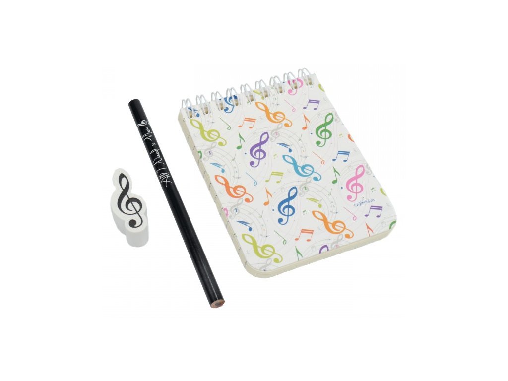 Dárkový set obsahuje linkovaný bloček, tužku a gumu ve tvaru houslového klíče.
