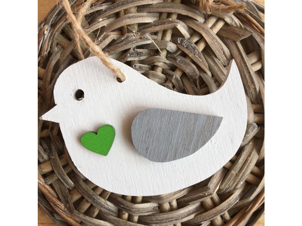 Dřevěný ptáček, ozdobený barevným srdíčkem, barva ptáčka je bílá, křídla má šedé. Ptáček je oboustranný.