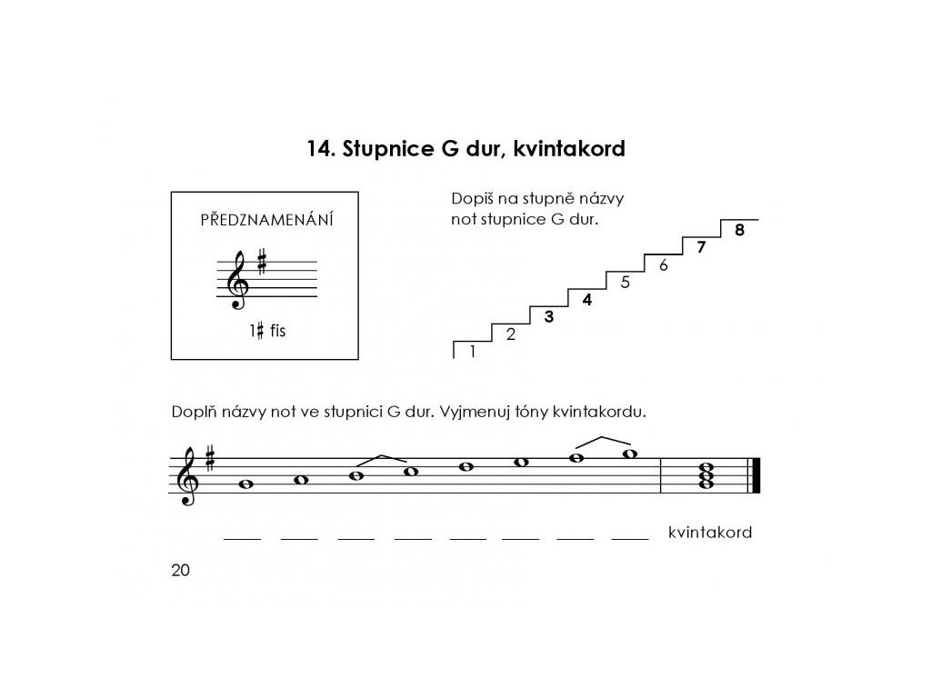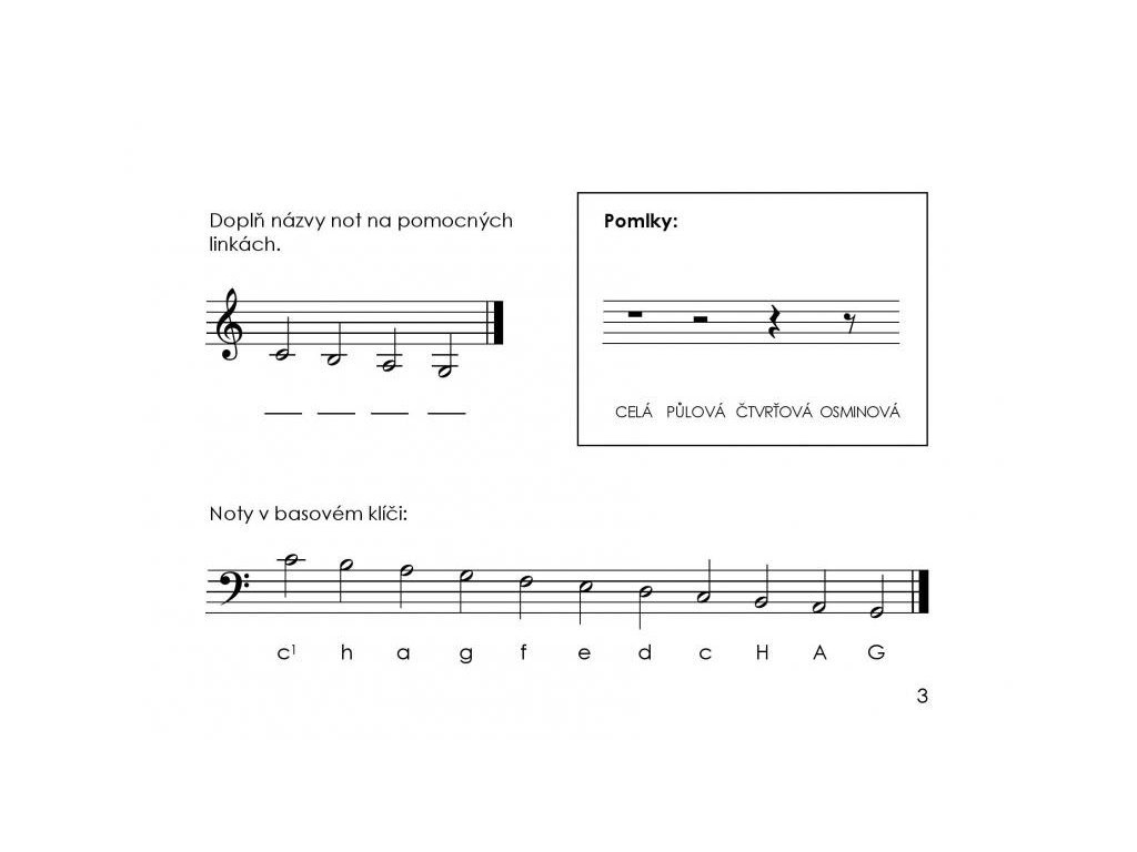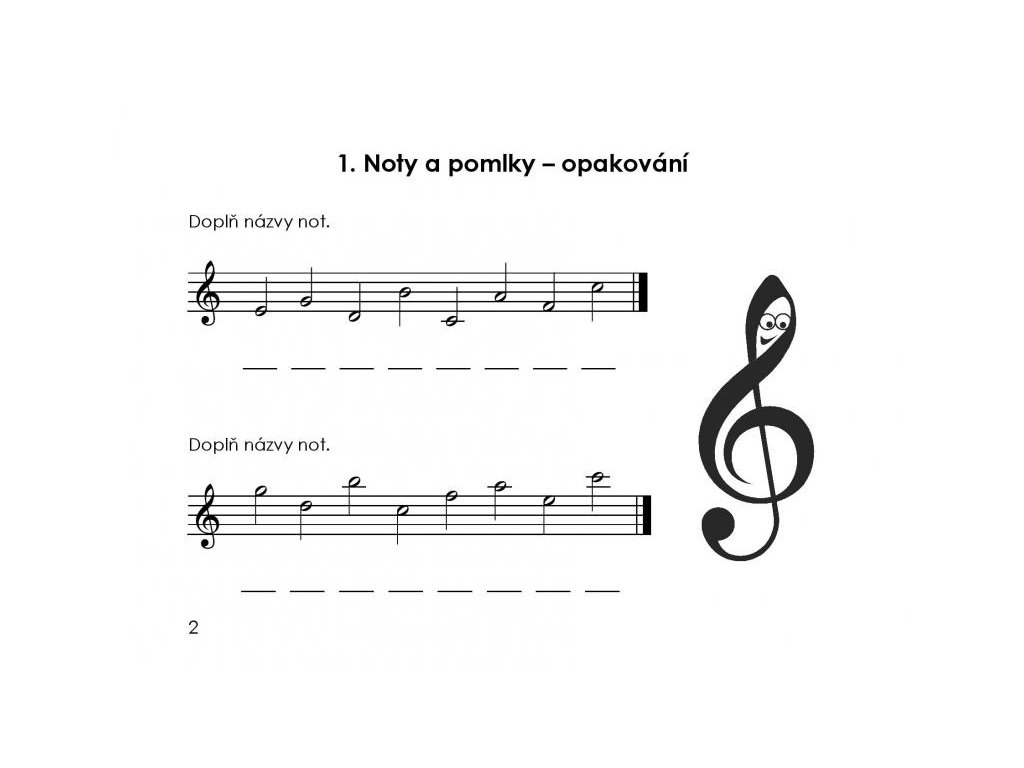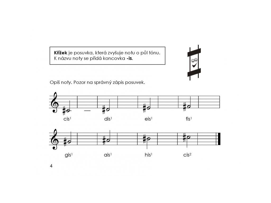 Pracovní sešit pro první ročník hudební nauky v ZUŠ. Hudební teorie je přehledně zpracovaná (názorně vysvětlené pojmy a předepsané příklady se zadáním, které žáci doplňují). Teorie na sebe navazuje - od jednoduchých příkladů k náročnějším úlohám. Cvičení na zápis not, stupnic a opakování hudebních pojmů. Žáci doplňují noty podle názvů, spojují čárou pojmy, které patří k sobě, dopisují taktové čáry a pod. Pro správný zápis not jsou v sešitě větší notové osnovy. Důležitou složkou jsou jednoduchá rytmická cvičení. Děti v sešitech najdou různé hudební hádanky a doplňovačky.