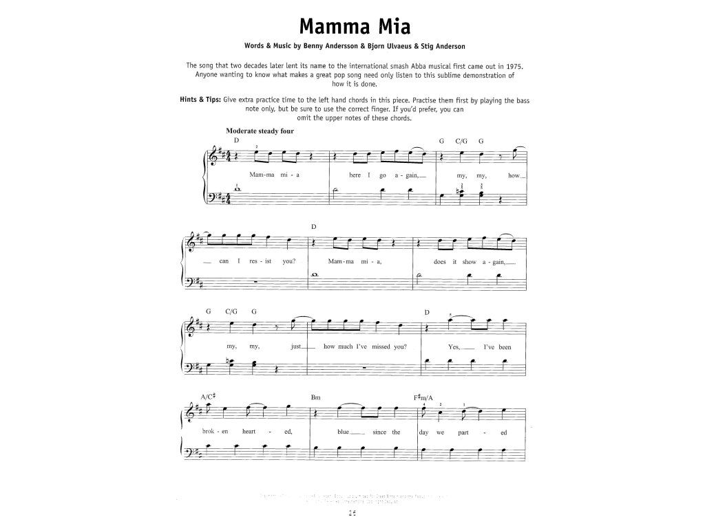 Úžasná kolekce, která obsahuje 25 písní švídské skupiny Abba. Tato snadná klavírní aranžmá s texty písní a symboly akordů vám umožní rychle se naučit a hrát tyto báječné písně!