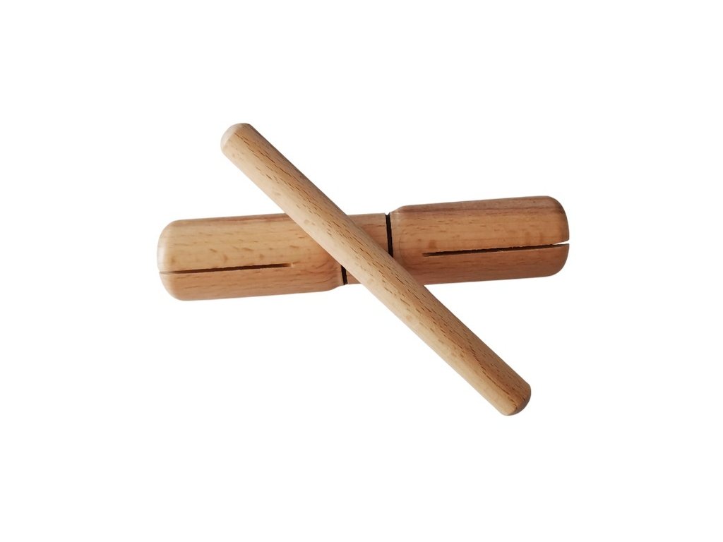 Dřevěný rourkový bubínek s paličkou bez rukojetí. Lze držet uprostřed v místě, kde se rourkový bubínek zužuje.